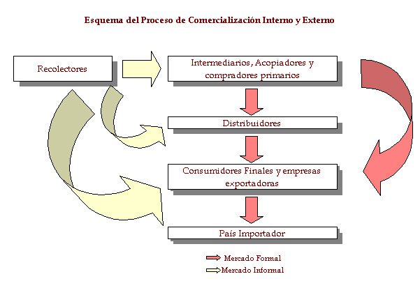 Características del Proceso Comercial Interno y Externo El esquema de comercialización es variable y poco rígido, en donde es común poder observar distintos agentes involucrados en el proceso comercial y a su vez en ocasiones, ausencia de agentes o "Bypass", causado esto por lo poco formal del negocio. De esta manera en ocasiones es posible encontrar tres o cuatro agentes involucrados y en otras ocasiones solamente sólo dos agentes: el "Recolector" que actúa a su vez como vendedor final y el consumidos o comprados final. De esta manera es posible encontrar los siguientes agentes comerciales involucrados en la cadena de comercialización: I.- Los Recolectores / vendedores Corresponden a campesinos y pequeños propietarios que recolectan las frondas de helechos o ramas de árboles o arbustos desde sus predios, desde predios de vecinos generalmente sin autorización o desde las orillas de los caminos públicos rurales. II .- Las intermediarios o compradores primarios : Estos, compran el producto a los recolectores y lo venden en los centros de acopio en las ciudades. En ocasiones venden sus productos en los mercados florales (Pérgolas) o florerías. Estos miembros de la cadena comercial de las Ramas y Frondas para adornos en ocasiones son también recolectores que crean un poder comprador y centro de acopio, para luego llevar el producto en su vehículo hasta los grandes compradores en los centros urbanos. III- Distribuidores : Corresponden a los agentes de compra y venta, estos son los que poseen el contacto con la florería o pérgola y compran directamente del intermediario o comprador primario. En ocasiones este agente compra también directamente a los recolectores. IV.- Comprador Final o Empresa Exportadora Corresponden a los usuarios finales del producto o a la empresa exportadora. La figura 30 muestra el proceso comercial interno y externo, así como los principales actores o agentes involucrados en la comercialización de las Frondas, Ramas Musgos y Líquenes para ornamentación.