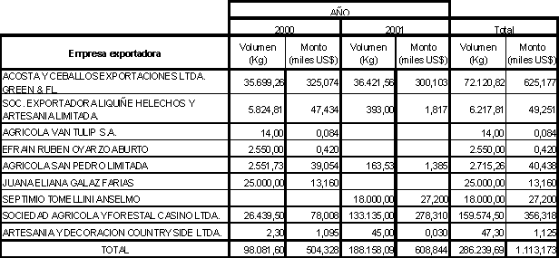 Demanda interna de Frondas y Ramas para Ornamentación Si consideramos que existen aproximadamente 15 locales en donde se venden arreglos florales, se tendría un consumo promedio por local de 50 Kg por florería o local, si consideramos un total de 50 florerías en la intercomuna Concepción - Talcahuano - San Pedro - Chiguayante, se estaría frente a una demanda de aproximadamente 2.500 kg/frondas. Lamentablemente no se tienen más antecedentes relativos a la demanda interna de este producto debido principalmente a lo informal del proceso comercial y a la desconfianza por parte de los comerciantes para entregar información. Por otro lado, el comercio formal está constituido por las empresas que se dedican a exportar estos productos, por ello el proceso está completamente regularizado por normas y leyes de exportación, existiendo por tanto registros de todas las transacciones que ocurren para el producto señalado. El cuadro 28 muestra las empresas que están demandando ramas y frondas para ornamentación, correspondiente a los años 2000 y 2001, en Kg. y US$ FOB. Cabe señalar que los valores mostrados aquí pueden tener pequeñas diferencias con los reales, ya que las bases de datos entregadas por Prochile y utilizadas para la confección del cuadro presentaban problemas de legibilidad. Cuadro 28. Empresas que exportaron ramas y frondas para ornamentación durante los años 2000 y 2001