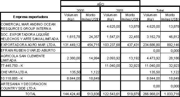 Aquí se puede observar que el número de empresas disminuyó de 8 empresas el año 2000 a 6 empresas el año 2001. Sin embargo los volúmenes demandados no disminuyeron, si no que por el contrario la demanda aumento considerablemente (100.000 kg aproximadamente). Este aumento en los volúmenes y disminución en el número de empresas involucradas se debe principalmente al considerable aumento en los montos transados por parte de la empresa Sociedad Agrícola y Forestal Casino Ltda. Siendo esta empresa la principal exportadora de Ramas y Frondas con objetivos de ornamentación junto con la empresa Acosta y Ceballos Exportaciones Ltda. De continuar esta tendencia al aumento registrada en estos dos años se podría hablar de un producto clave y con altas posibilidades de escalamiento productivo. El cuadro siguiente muestra las principales empresas generadoras de demanda interna de Musgos y Líquenes durante los años 2000 y 2001. Cabe señalar que los valores mostrados aquí pueden tener pequeñas diferencias con los reales, ya que las bases de datos entregadas por Prochile y utilizadas para la confección del cuadro presentaban problemas de legibilidad. Cuadro 29. Empresas que exportaron Musgos y Líquenes para ornamentación durante los años 2000 y 2001