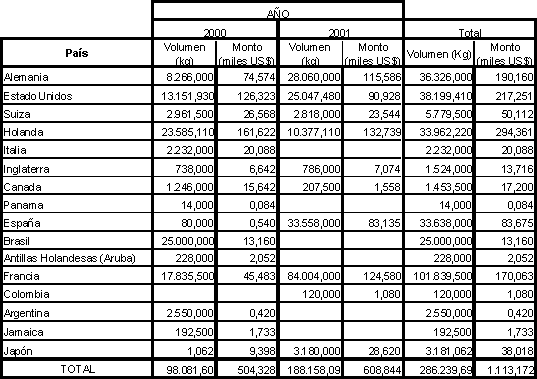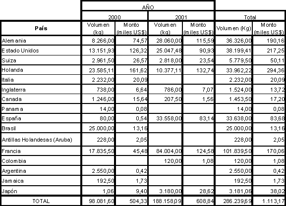 Entre los principales países demandantes de Ramas y Frondas para ornamentación están Francia, España, Alemania, USA, seguidos de Holanda, Japón y Suiza. Esto permite estimar que frente a estos mercados de gran potencial, es posible aumentar la demanda y lograr por ende una mejor alternativa de negocio, entregando estratégicamente productos de mejor calidad y más elaborados aumentando de esta manera el valor agregado del producto. Cabe destacar también que a pesar de haber disminuido el número de países objetivos, los montos comercializados fueron mayores para el año 2001, así como tampoco existió mucho movimiento o recambio de países, es decir los no hubo ingreso de nuevos países al negocio a excepción de Colombia, esto está señalando que algunos países aumentaron fuertemente su demanda por este tipo de productos. Por otro lado, el cuadro 31 muestra la demanda externa de Musgos y Líquenes para ornamentación durante los años 2000 y 2001. Se debe dejar claro que al igual que en los cuadro 1, 2 y 3, los valores mostrados pueden tener pequeñas diferencias con los reales, ya que las bases de datos entregadas por Prochile y utilizadas para la confección del cuadro presentaban problemas de legibilidad. Cuadro 31. Destino de las exportaciones o demanda externa de Musgos y Líquenes para ornamentación durante los años 2000 y 2001.